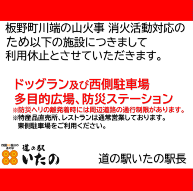 現在発生しております 板野町川端の山火事 消火活動対応のため、以下の施設を利用休止とさせていただきます。