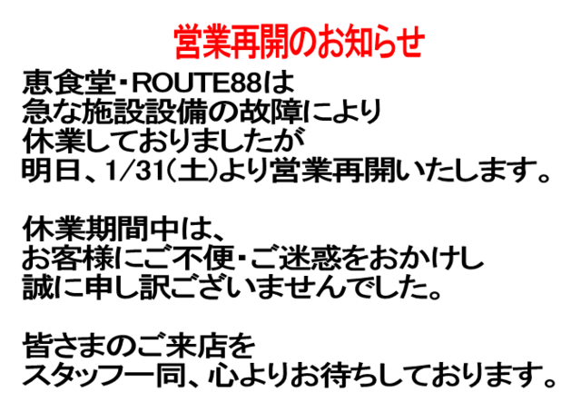 【恵食堂・ROUTE88】営業再開のお知らせ